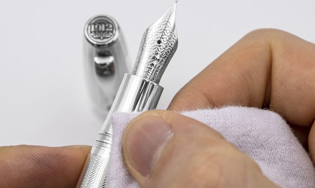 Fountain pens made of sterling silver or silver-plate should be cleaned with silver polish and a soft cloth. For intricate engravings and fretwork found on top-tier pens, dirt and tarnishing can be removed with a silver brush or a soft toothbrush.